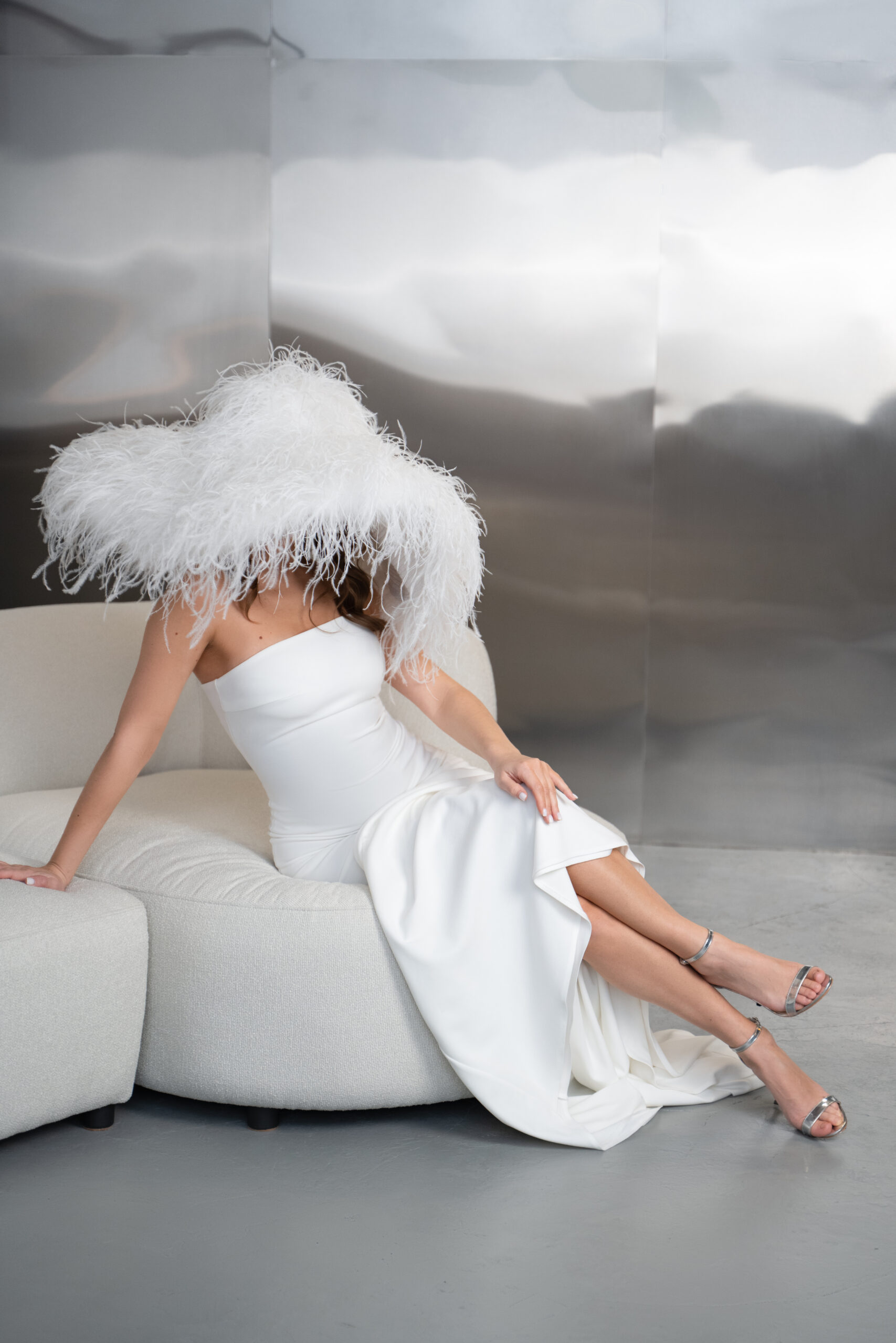 Make an entrance no one will forget with Lave Bridal’s Feather Couture Hat—a modern homage to Old-World extravagance. Hundreds of ethically sourced, hand-dyed ostrich plumes are individually anchored to a lightweight wire frame, creating a billowing silhouette that seems to hover in mid-air. The feathers graduate in length, with the longest tips skimming the brow for an air of playful mystery while shorter, downy layers add luxurious depth and movement.