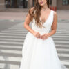 Viki – an elegant wedding gown by designer Irina Mishustina, crafted from light, airy tulle with a V-neckline and a high slit. This popular model accentuates your figure while subtly concealing imperfections, making it perfect for both wedding ceremonies and photoshoots