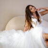 The Viki dress by designer Irina Mishustina is a refined blend of lightness and elegance. Made from soft, airy tulle, it flows beautifully, creating a romantic and ethereal look. The V-neckline and graceful high slit on the leg add sophistication and style, making it an ideal choice for brides who wish to highlight their figure while gently masking minor flaws. Due to its lightweight design, the dress is comfortable to wear all day long and is perfectly suited for both wedding ceremonies and memorable photoshoots